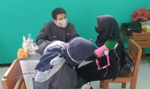Saat penyelenggaraan vaksinasi terpantau berjalan cukup lancar. Nampak para pelajar antusias mengikuti prosesi vaksinasi dengan menerapkan prokes ketat. (Agus/frisca/tintajabar.com)