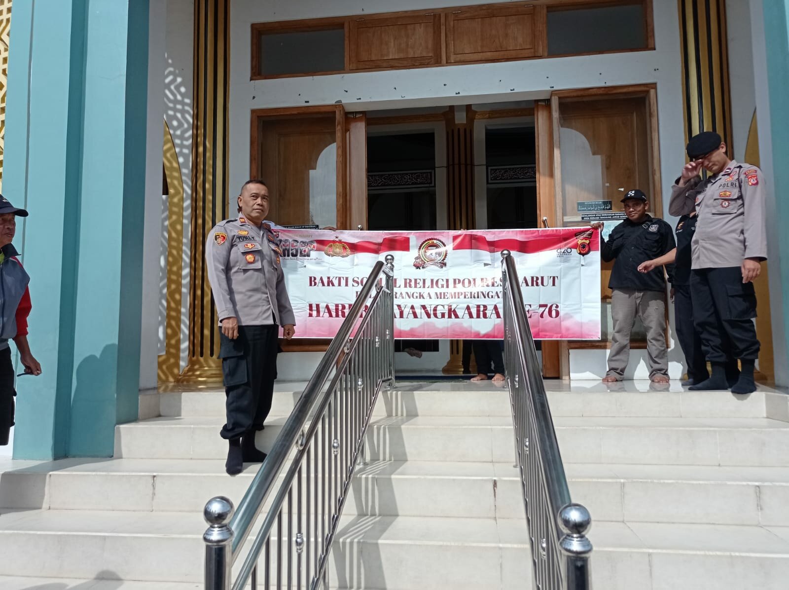 Kepolsek Bayongbong Iptu Yusli Yulianto SH menyampaikan, “Bahwa di Hari Ulang Tahun Bhayangkara ke 76 ini, kami tulah melaksanakan Baksos Religi yaitu memberikan sebuah jam dingding dan kami juga membersihkan sampah-sampah yang berserakan di halaman mesjid, membersikan WC dan mengepel, ini kami bagi dua tim yaitu di mesjid Al Purqon di Jamban Sari sama seperti disini melaksanakan hal-hal yang sama, dengan adanya kegiatan ini, kami bisa bersilaturami dengan pengurus mesjid besar menjadi terasa lebih nyaman dan indah”, pungkasnya