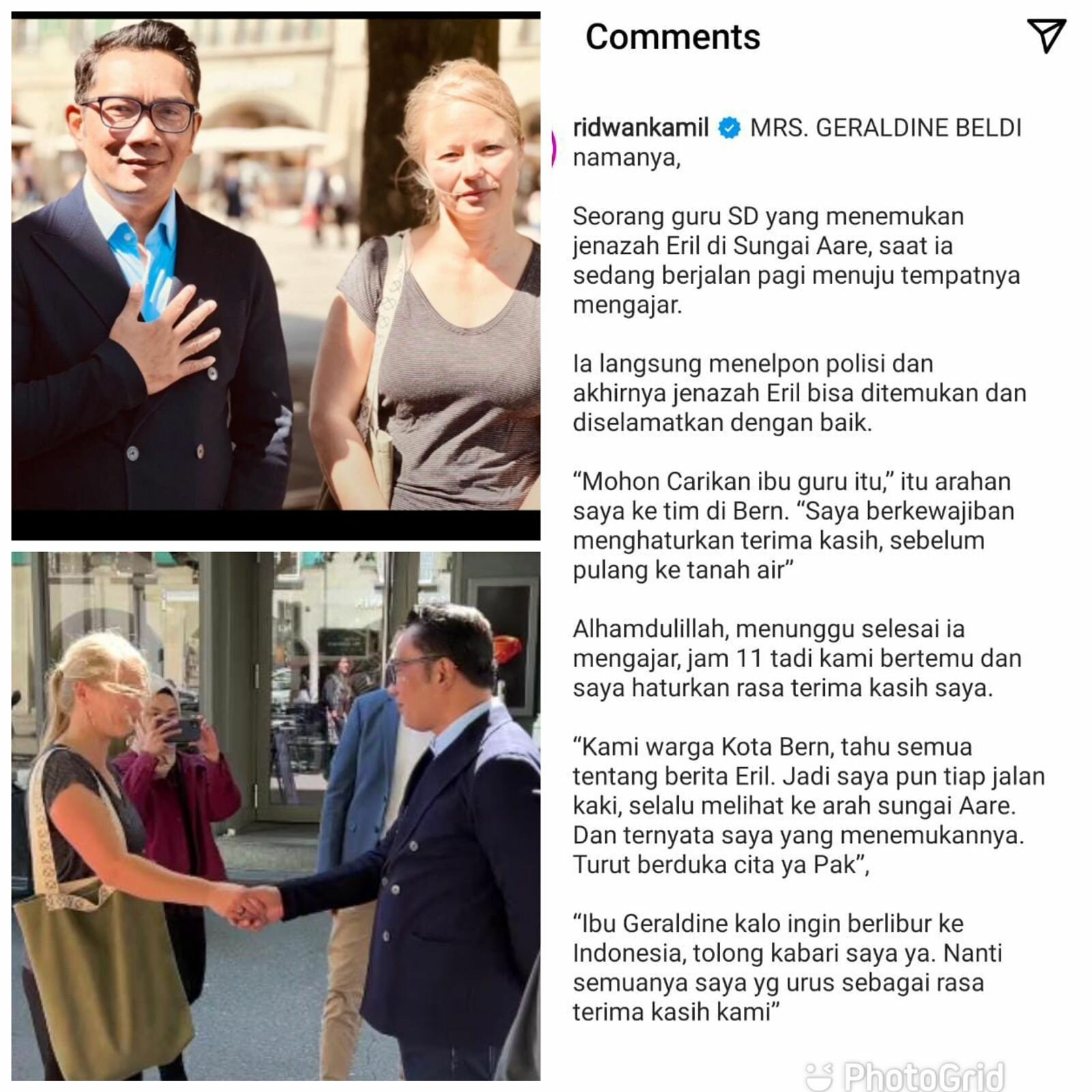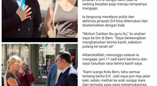“Kami Warga Kota Bern tahu semua tentang berita Eril, dan saya pun punya dua anak. Jadi saya tiap jalan kaki selalu melihat ke arah sungai Aare dan ternyata saya yang menemukannya, turut berdukacita ya pak,” jelas Geraldine