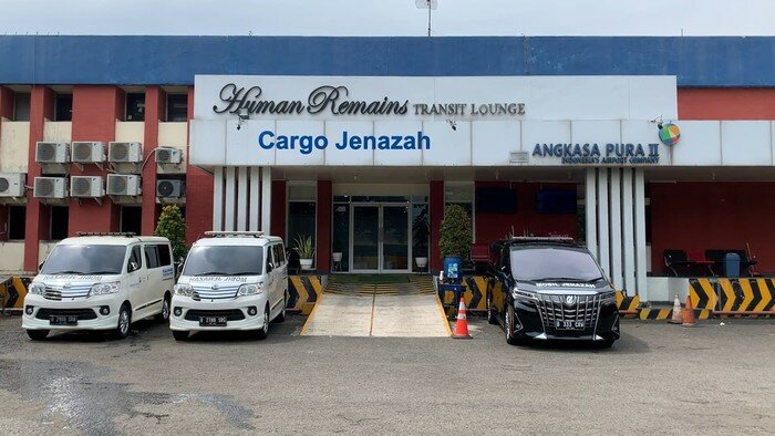 Karangan bunga dukacita berjejer di terminal kargo jenazah. Selain itu, sejumlah personel polisi berjaga di lokasi.