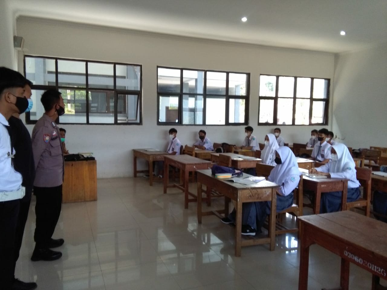 TINTAJABAR.COM, GARUT – Polsek Cisompet Polres Garut laksanakan Giat Sosialisasi prokes Pembelajaran KBM Tatap Muka Terbatas di SMAN 22 Garut Kec Cisompet Kab Garut. Senin (6/9/2021).