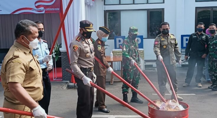 TINTAJABAR.COM, SUMEDANG – Kapolres Sumedang Akbp. Eko Prasetyo menghadiri pemusnahan barang bukti di kantor Kejaksaan Negeri Sumedang. Selasa (31/8/2021)