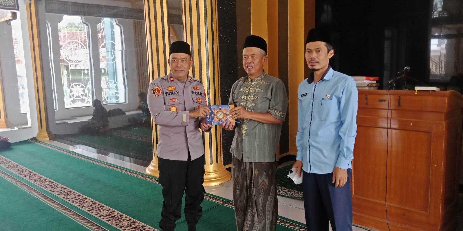 Dipampingi bhabinkanntibmas kapolsek setelah melaksanakan sholat Dzuhur berjamaah di mesjid besar kebanggaan masyarakat kecmatan Bayongbong menyerahkan secara simbolis di saksikan sekmat kecamatan Bayongbong yang kebetulan ikut sholat berjamaah ,