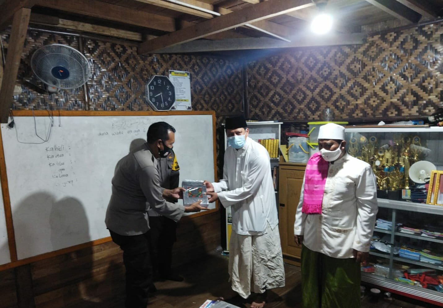 TINTAJABAR.COM, KARAWANG – Kapolsek bersama Bhabinkamtibmas Polsek Pedes Polres Karawang menyerahkan bantuan sarana kontak berupa 20 Mushaf Al-Qur’an dan 5 senter untuk menunjang aktifitas belajar- mengajar para santri dan tenaga pengajar agama.