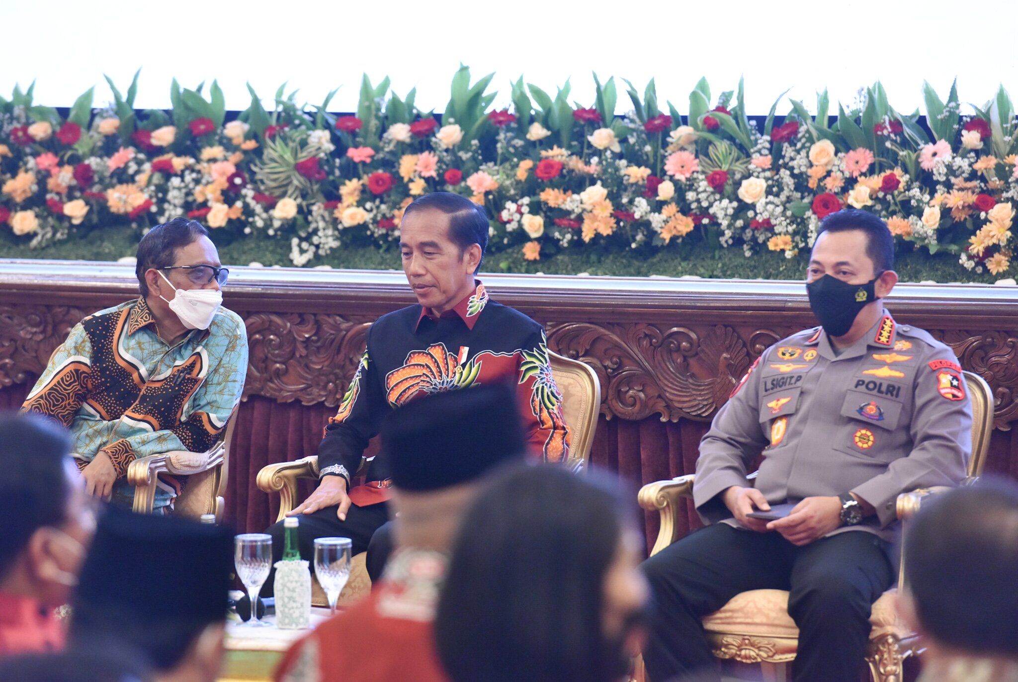 Menko Polhukam Mahfud MD bersama Kapolri Jend Listyo Sigit Prabowo mendampingi Presiden Jokowi saat memberikan arahan kepada jajaran Polri, di Istana Negara, Jakarta, Jumat (14/10/2022).