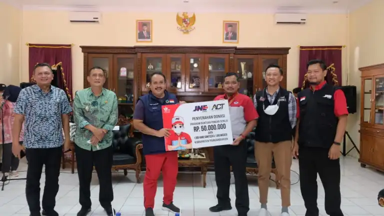 Bertempat di Kantor Bupati Pangandaran, Desa Parigi, Jawa Barat, Eri Palgunadi selaku VP of Marketing JNE bersama Taufik Perdana, selaku Head Regional ACT Priangan Timur menyerahkan secara simbolis donasi Bantuan Pangan, Masker dan Handsinitizer kepada H. Jeje Wiradinata selaku Bupati Pangandaran yang di damping H. Ujang Ending Irawan selaku Wakil Bupati Pangandaran. Bantuan tersebut nantinya akan diberikan kepada warga Kabupaten Pangandaran.