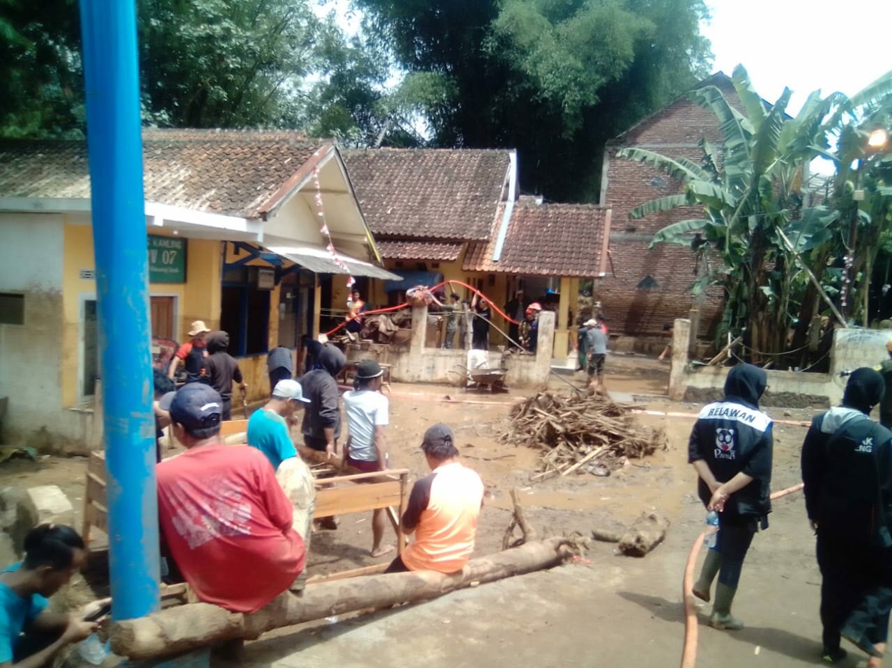 “Di pagi harinya kami bahu membahu dengan unsur kelembagaan yang lain membersihkan puing-puing sampah yang menggunung ,terutama sampah sisa-sisa kayu bekas rumah yang terseret banjir bandang ini”. Jelasnya.
