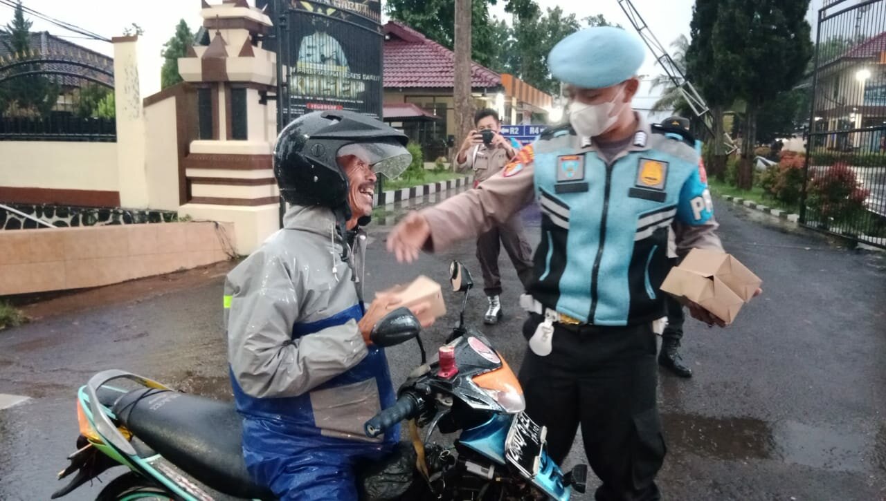 TINTAJABAR.COM, GARUT – Minggu sore pukul 17.30 Wib hari pertama menjalankan ibadah puasa, di jalan Jenderal Sudirman no 204 tanggal 03 April 2022, dalam hujan gerimis personil Polri berjajar berbagi takjil kepada setiap pengendara yang melewati kantor Polres Garut,