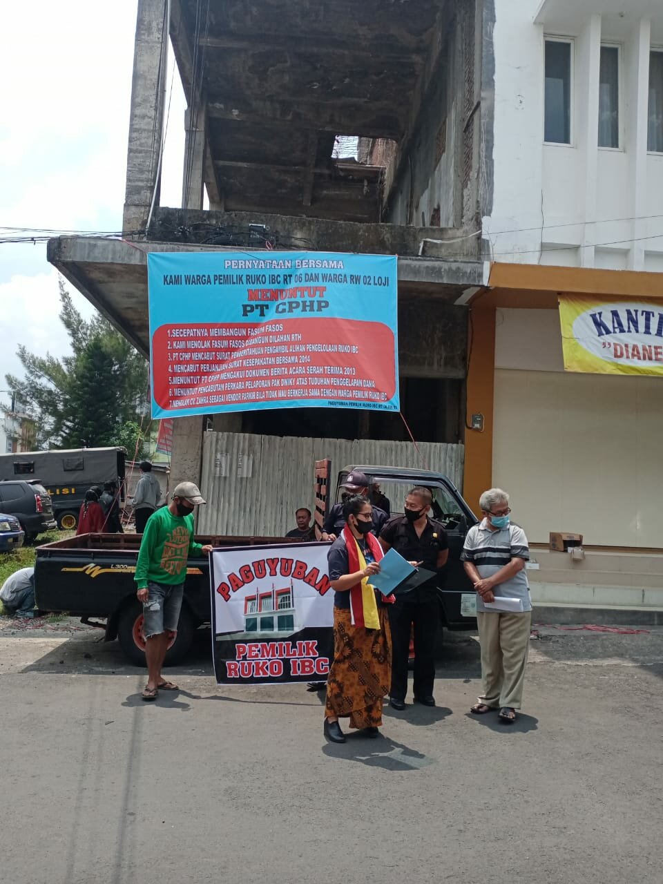 Selesai membacakan pernyataan sikap, Laraswati, Sujono dengan warga pemilik ruko IBC langsung berjalan kaki menuju Kantor/Ruko CV. Zahra dan berorasi lagi serta membacakan surat peryataan sikap.