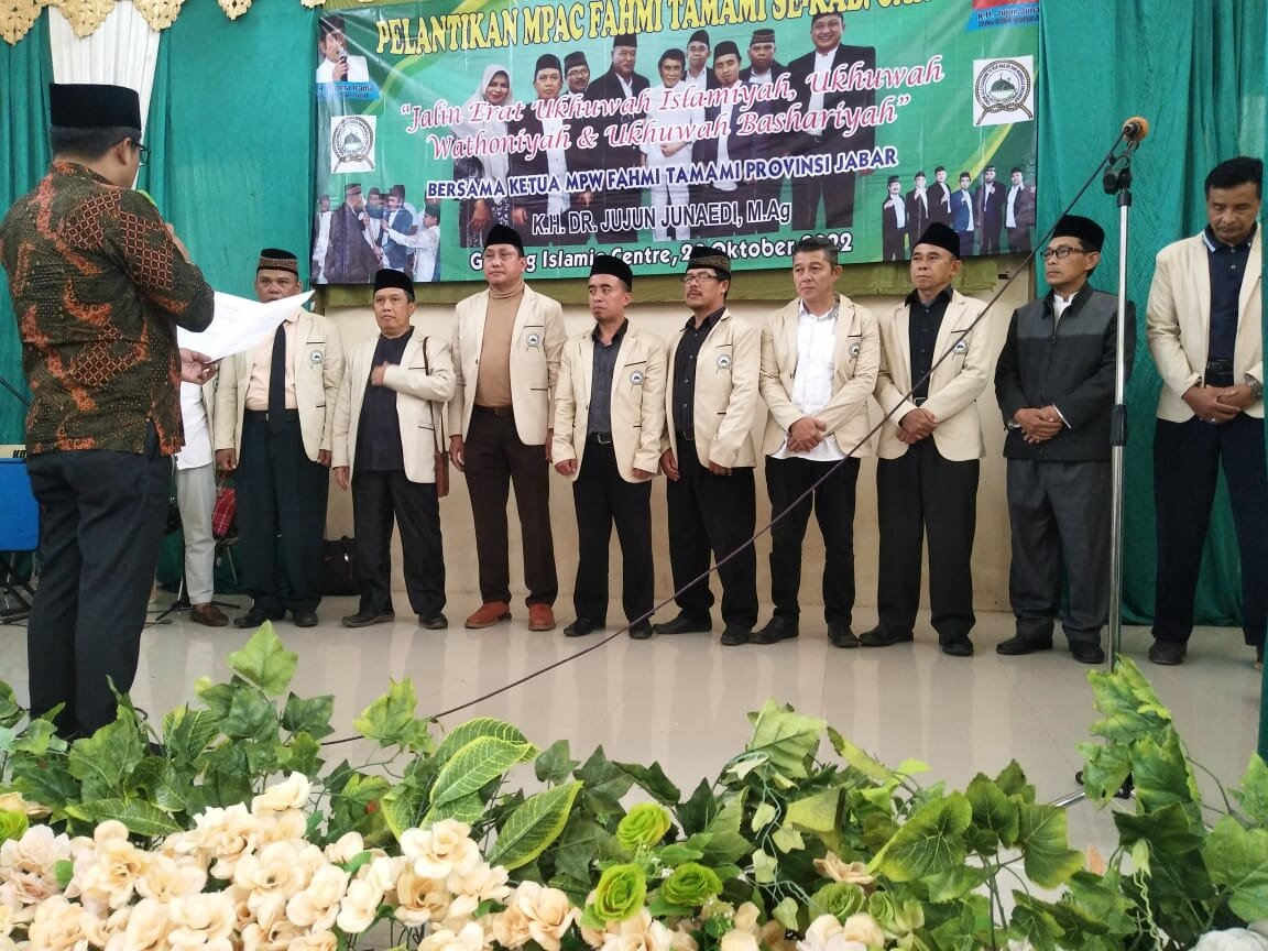 Selanjutnya kami mengucapkan terimakasih dan penghargaan yang setinggi-tingginya kepada Yang Terhormat, KH. DR. Jujun Junaedi, M.Ag, sahabat kami yang rencananya mau hadir untuk melantik Pengurus MPAC FAHMI TAMAMI, tapi karena beliau belum fix kesehatan, akhirnya mewakilkan kepada KH. Drs. Agus Munawir.