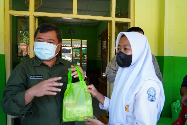 Dalam kunjungannya, Rudy secara simbolis menyerahkan bantuan dari Dinas Ketahanan Pangan (DKP) Kabupaten Garut, berupa paket makanan bergizi untuk siswa dan guru di SMPN 4 Pakenjeng.