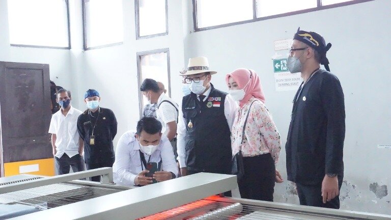 TINTAJABAR.COM, GARUT – Bupati Garut, Rudy Gunawan, mendampingi Gubernur Jawa Barat, Ridwan Kamil, beserta Ketua Dewan Kerajinan Nasional Daerah (Dekrasnada) Jawa Barat, Atalia Praratya Kamil, saat meninjau satuan pelayanan pengembangan industri perkulitan Garut yang berlokasi di Unit Pelaksanan Teknis Daerah (UPTD) Industri Pangan, Olahan, dan Kemasan (IPOK) Provinsi Jawa Barat, tepatnya di kawasan Sukaregang, Kecamatan Garut Kota, Kabupaten Garut, Kamis (6/1/2022).