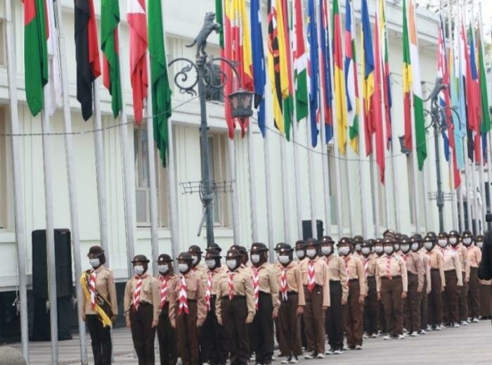 Tahun ini, semangat yang digaungkan adalah pemulihan bersama pascaCovid-19 hingga perdamaian. Pengibaran bendera dilakukan oleh anggota pramuka.