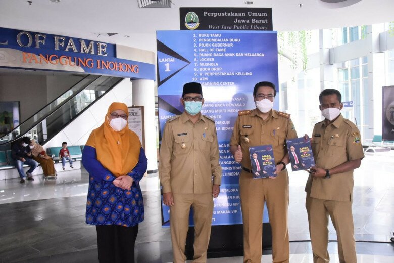 TINTAJABAR.COM, DEPOK – Wakil Wali Kota Depok, Imam Budi Hartono (IBH) (kedua dari kiri) didampingi Kepala Diskarpus Kota Depok, Siti Chaerijah Aurijah (paling kiri) mengunjungi Dispusipda Jawa Barat, Senin (03/01/22).Pada kesempatan tersebut, IBH juga menyerahkan buku karangannya dengan judul Anak Sopir Jadi Wakil Wali Kota kepada Kepala Dispusipda Provinsi Jawa Barat Ahmad Hadadi.