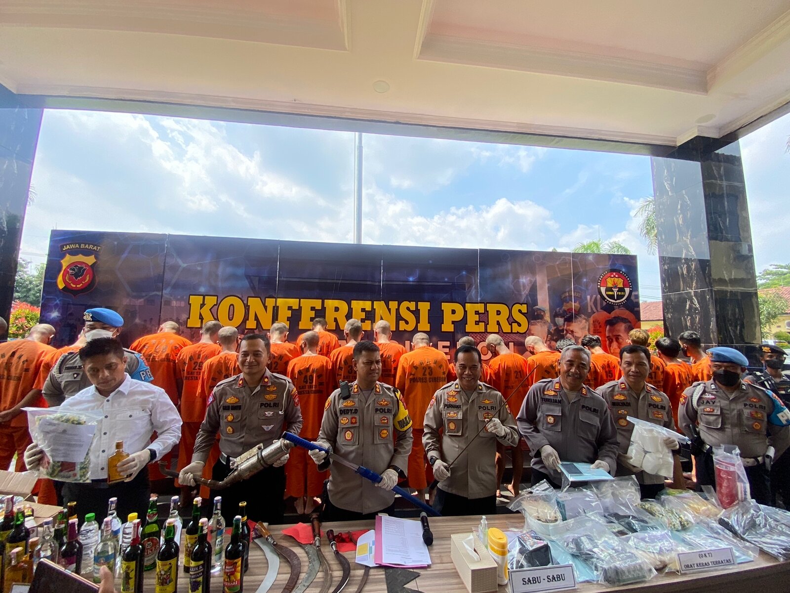 Adapun jumlah barang bukti yang berhasil diamankan, di antaranya, 25,79 gram sabu-sabu, dan 13.050 butir obat keras terbatas yang terdiri dari 5.364 butir Dextro, 5.028 butir Trihexiphenidyl, serta 2.661 butir Tramadol. Selain itu, 378 botol miras pabrikan, 51 liter ciu, dan 237 liter tuak juga turut diamankan petugas.