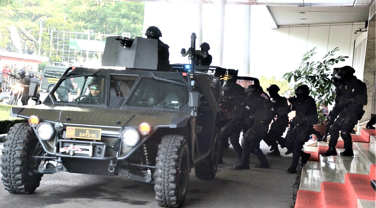 TINTAJABAR.COM, BANDUNG – Prajurit Satuan elite Kodam III/Siliwangi diterjunkan untuk membebaskan warga sipil yang disandera di Area Perkantoran PT. Telkom, Jalan Japati No. 1 Kota Bandung, Jawa Barat, Sabtu (18/12/2021).