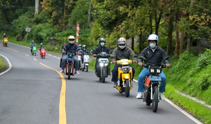 TINTAJABAR.COM, KOTA BANDUNG – Gubernur Jawa Barat Ridwan Kamil berwisata menggunakan sepeda motor listrik bersama komunitas motor listrik dengan rute Glamping Legok Kondang-Jembatan Rengganis Suspension Bridge, Ciwidey, Kabupaten Bandung, Sabtu (17/9/2022).