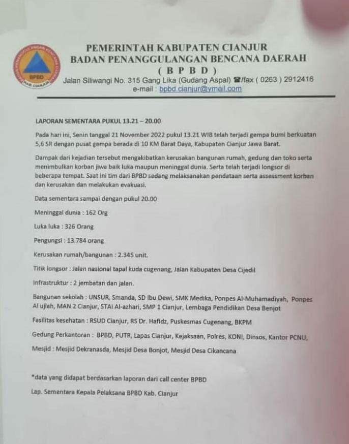 Kamil juga menyampaikan di beberapa lokasi masih ada warga hilang dan diduga masih terperangkap longsor. Karena itu Gubernur menduga jumlah korban meninggal bisa lebih besar, saat tim melakukan evakuasi “Seluruh infrastruktur sudah datang. Evakuasi akan kami mulai Selasa (22/11/2022) pagi dengan beberapa helikopter dari BNPB yang siap membantu,” katanya.