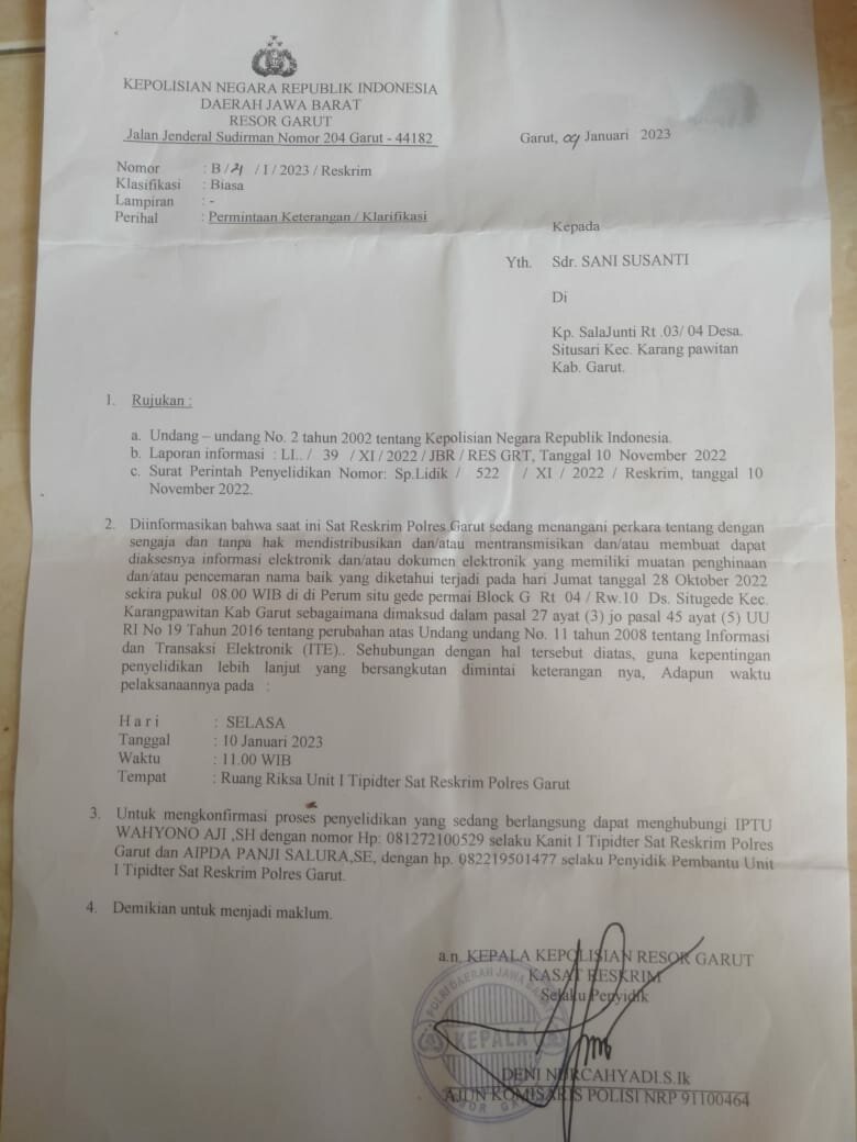 Isi surat permintaan keterangan/ klarifikasi tersebut saudari (S) yang merupakan wartawan dari Media RSI Kabiro Garut telah mencemarkan nama baik DPK APDESI Kecamatan Karangpawitan Kabupaten Garut atas pemberitaan pemberitaan yang di muat oleh redaksi media Online RSI. Selasa (10/01/2023)