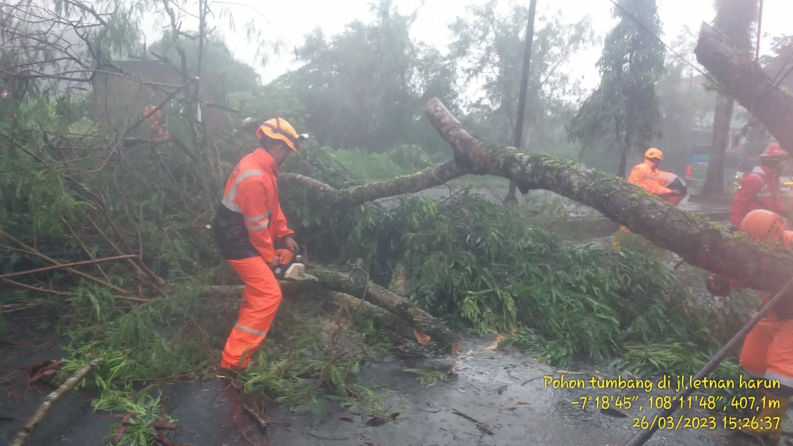 Menurut Kasat Samapta Polres Tasikmalaya Kota AKP Sunarto mengatakan bahwa personelnya membantu evakuasi pohon tumbang setelah angin kencang dan hujan mengguyur Kota Tasikmalaya.