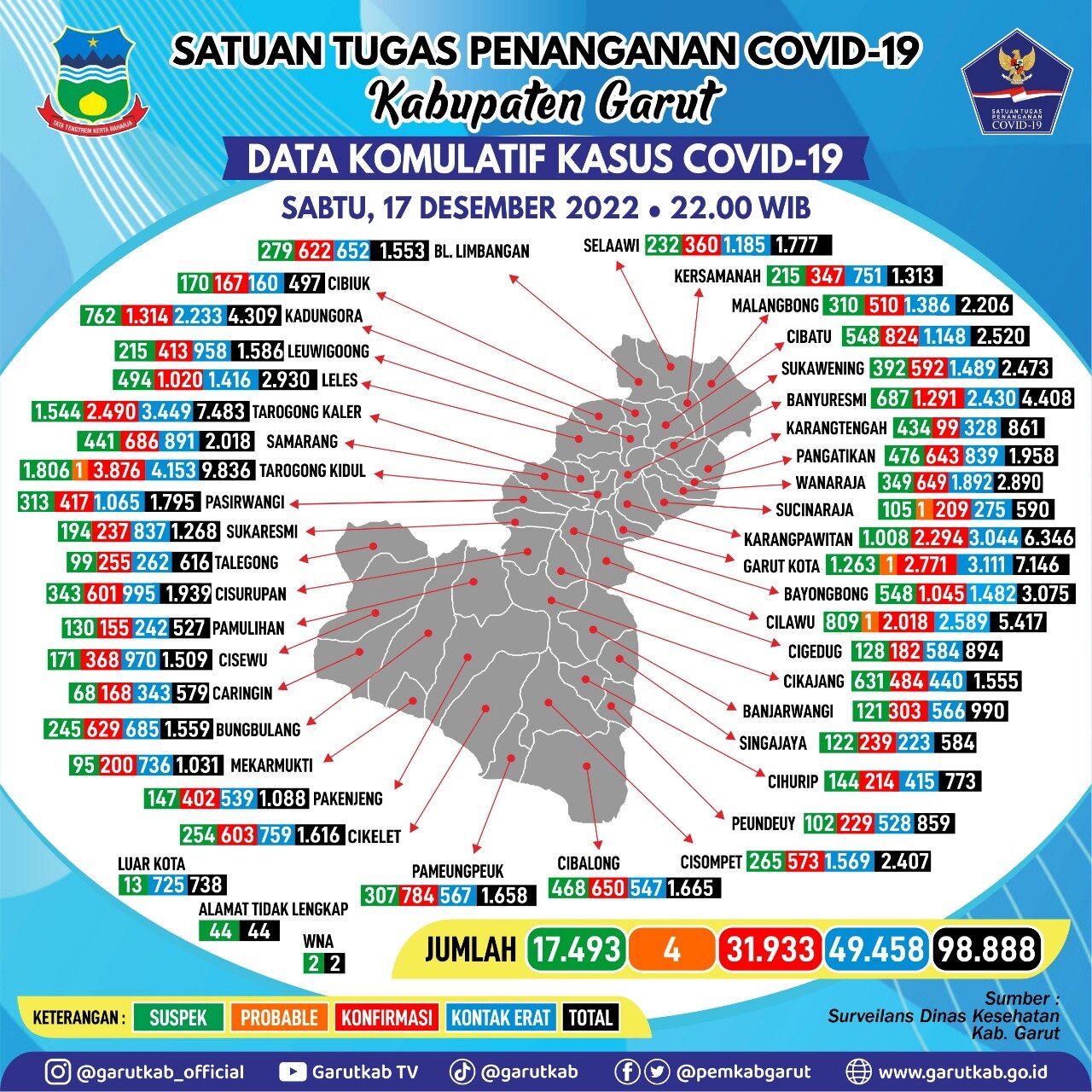TINTAJABAR.COM, GARUT – Perkembangan Kasus Covid-19 di Kabupaten Garut s.d Hari ini. Sabtu, 17 Desember 2022 Pukul 22.00 WIB.