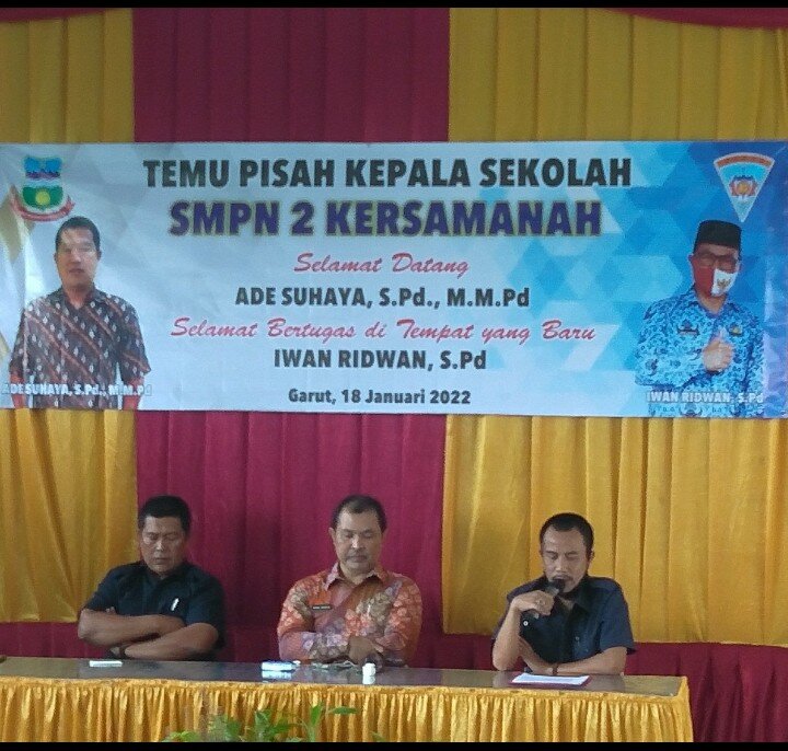 Serah terima jabatan Kepala Sekolah baru. Yang di laksanakan langsung di sekolah SMP N 2 Kersamanah Sukamerang Kecamatan Kersamanah Kabupaten Garut. Tentu saja hadir Kepala Sekolah lama dan kepala sekolah yang baru, para Staf guru ,serta Pengurus Komite.