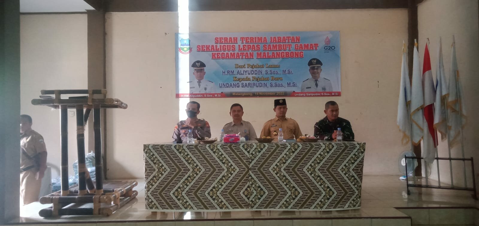 Sertijab Camat Malangbong H.Rm.Aliyudin S.sos.,Msi Camat lama pindah ke Kecamatan Leles dan Camat Undang Saripudin S.Sos.Msi sebagai Camat baru dari Kecamatan Malangbong, pada Rabu, 14 November 2022 di Aula Sesa Cisitu Kabupaten Garut.