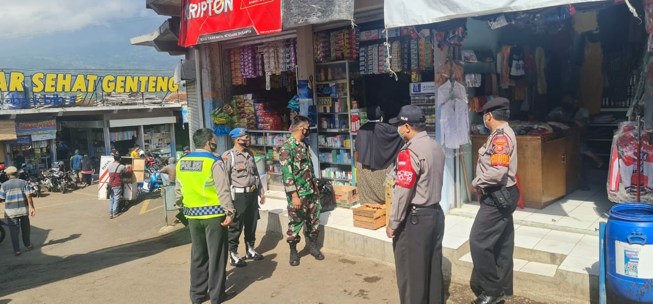 Dengan cara stasioner di gerbang Pasar Sehat Genteng, personil Polsek Cilawu membagikan masker kepada masyarakat yang akan memasuki Kawasan Patuh Prokes Pasar Sehat Genteng.
