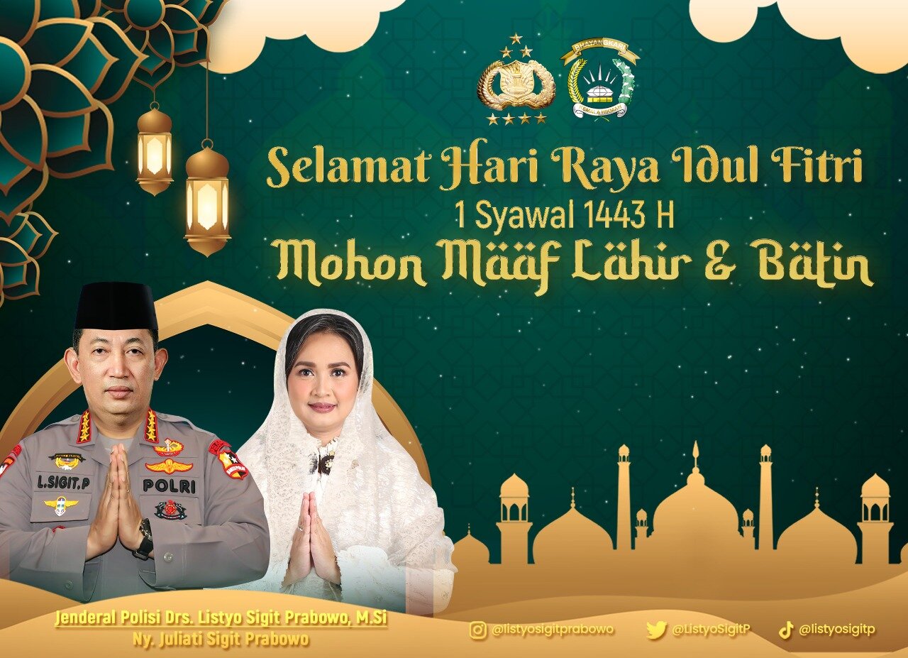 “Di tengah gema takbir yang berkumandang di hari fitrah, saya Jenderal Polisi DRS. Listyo Sigit Prabowo, M.SI Kepala Kepolisian Negara Republik Indonesia (Kapolri), mengucapkan selamat Hari Raya Idul Fitri 1443 Hijriah. Minal Aidin Wal Faizin, mohon maaf lahir dan batin, kepada seluruh umat muslim di Indonesia,” kata Sigit dalam tayangan videonya, Minggu (1/5/2022).
